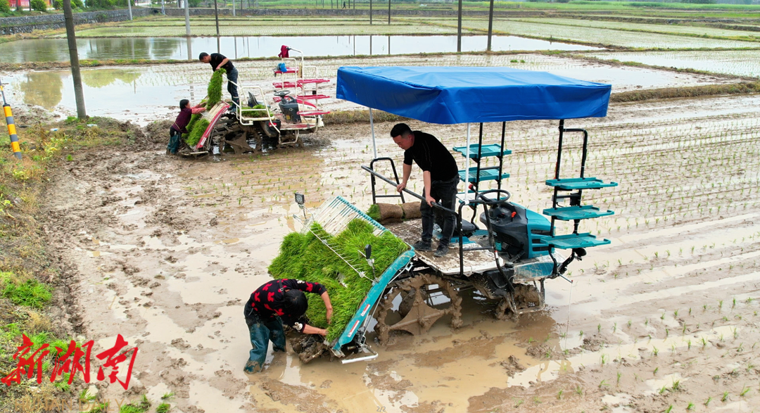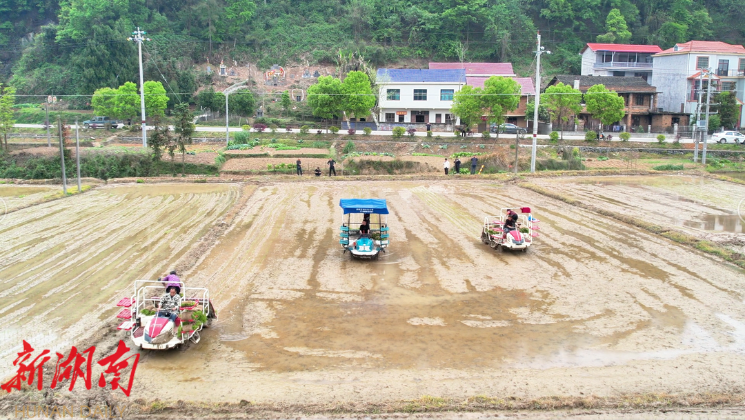 田垄上,插秧机正在进行自动化早稻插秧作业,一颗颗秧苗被有序地种到水田中,扎根于“希望的田野”上,满满“科技范”生产画卷跃然眼前。