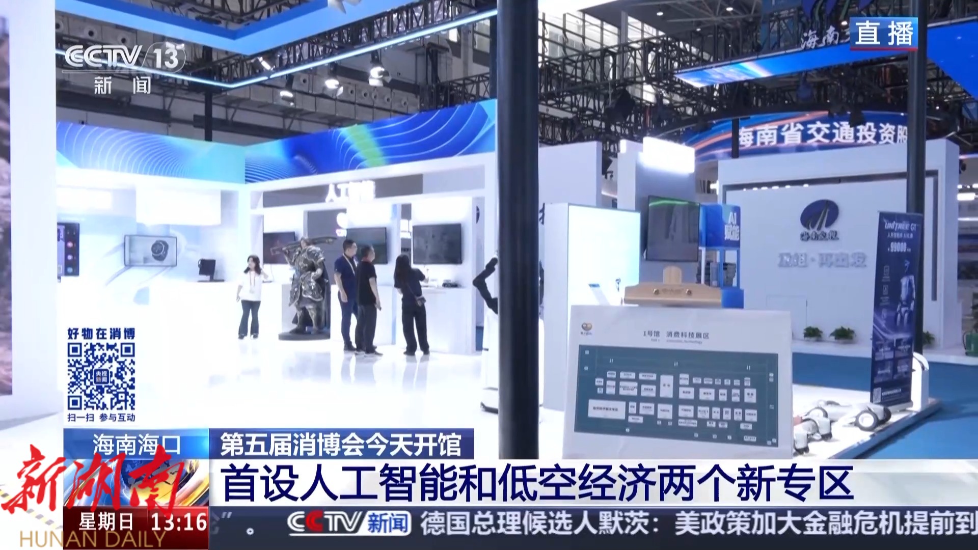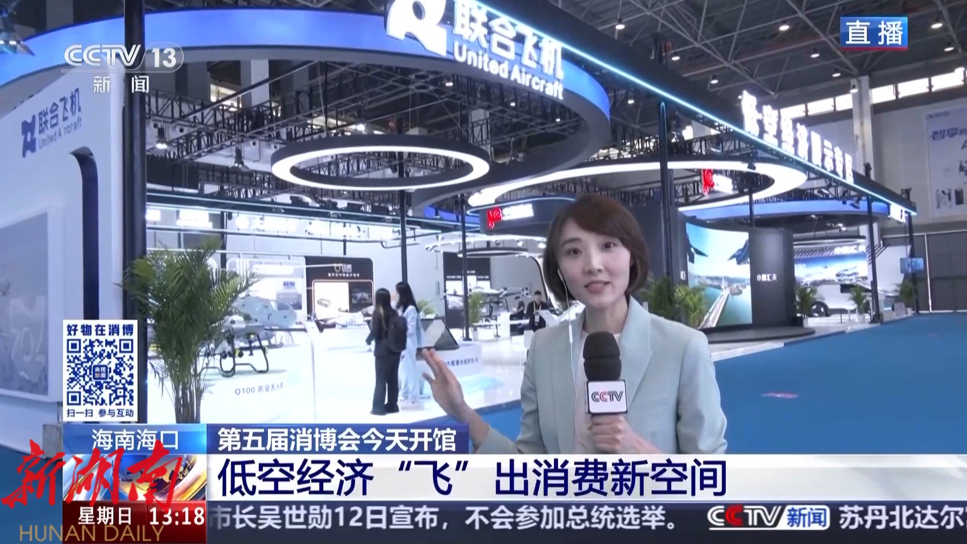 总台央视记者 宋菀: 其实在1号馆,除了这些具身智能展品很吸睛之外,低空经济专区展出的飞行汽车和无人机也是今年消博会上的一大亮点。随着低空经济连续两年被写入政府工作报告,将来,它们有望在城市交通、旅游观光等场景实现规模化应用,低空经济将飞出消费新空间。