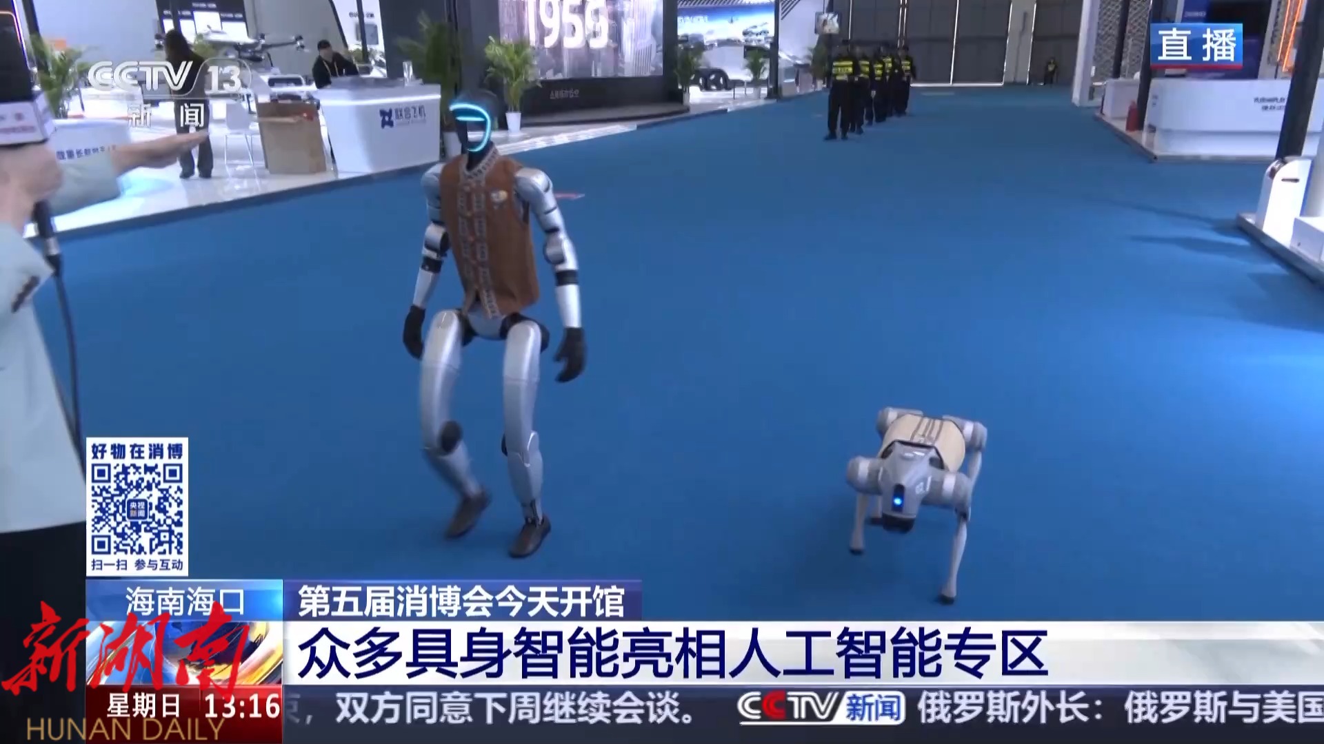 总台央视记者 宋菀: 现在向我们走来的就是一个人形机器人和一只机器狗,身穿的服饰都很有海南特色,听说是专门为参加消博会定做的非遗黎锦服饰。