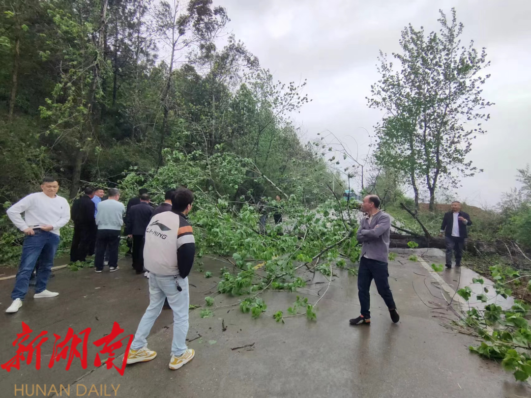 新桂阳4月14日讯(通讯员 欧阳碧云)4 月 12 日,一场大风大雨极端天气突袭敖泉镇。镇内多条道路旁大树倒伏,横亘路面,致使交通阻断,严重危及过往车辆与行人安全。敖泉镇政府迅速反应,紧急组织力量开展抢险救援。