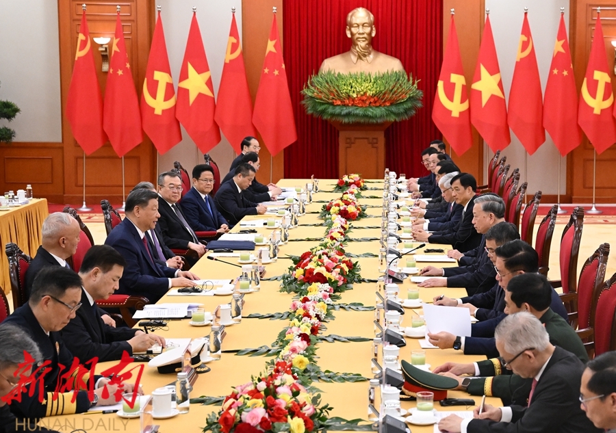 习近平强调,今年是中越建交75周年暨“中越人文交流年”。75年来,无论国际风云如何变化,双方在争取国家独立和民族解放的斗争中相互支持,在社会主义建设事业中携手并进,在推进各自现代化进程中砥砺前行,成为社会主义国家团结合作的典范。面对变乱交织的国际形势,中越两国坚持和平发展,深化友好合作,为世界带来了宝贵的稳定性和确定性。站在新的历史起点上,双方要继往开来、携手前行,赓续“越中情谊深、同志加兄弟”的传统友谊,按照政治互信更高、安全合作更实、务实合作更深、民意基础更牢、多边协调配合更紧、分歧管控解决更好的“六个更”总体目标,高质量推动全面战略合作,确保中越命运共同体建设行稳致远,为构建人类命运共同体作出新的更大贡献。