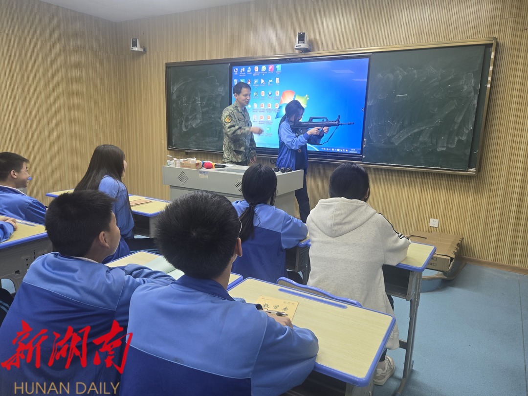 此次讲座还准备了95式突击步枪模型和手榴弹模型,主讲人介绍了相关枪支弹药的适用场所和使用理论,并邀请学生上台体验。现场气氛热烈,寓教于乐提高青少年国家安全意识。