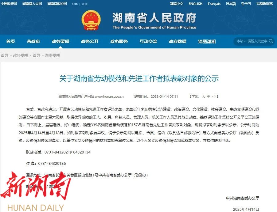 最新消息,湖南省委办公厅发布《关于湖南省劳动模范和先进工作拟表彰对象的公示》,确定了339名湖南省劳动模范和157名湖南省先进工作者拟表彰对象。其中,永定区崇文街道办事处南正社区党总支书记、居委会主任田晏冰拟获“2025年湖南省劳动模范”称号。