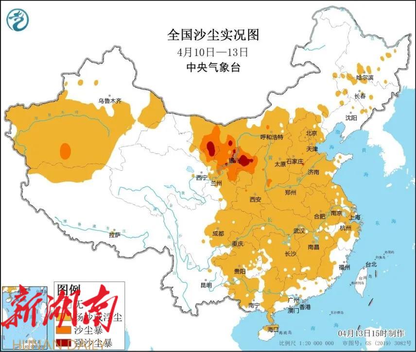 受大风和传输影响,10日至13日中东部大部地区出现今年以来最大范围沙尘天气,最远传输至海南岛北部, 影响面积超430万平方公里,其中,内蒙古西部、宁夏、甘肃中部以及陕西延安、榆林和宝鸡、山西运城、河北衡水和邢台等局地出现沙尘暴或强沙尘暴。