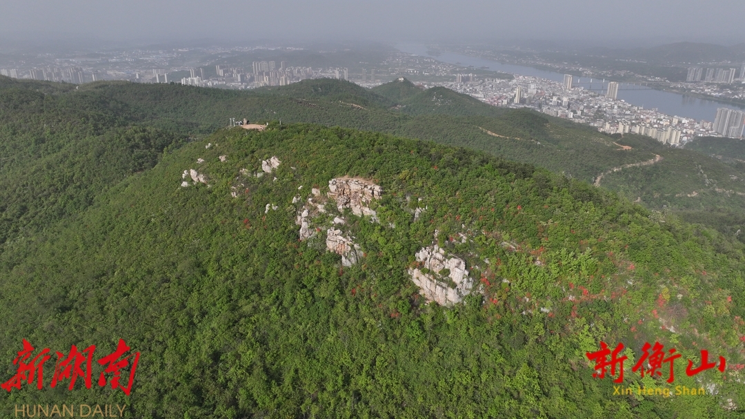 ( 点缀着映山红的青山与远处若隐若现的衡山县城相映成趣 )