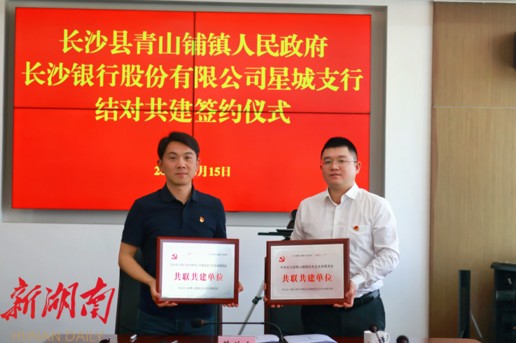 在签约仪式上,双方共同签署《长沙县青山铺镇人民政府与长沙银行股份有限公司星城支行全面战略合作协议》。随后的授牌仪式上,双方互授共建牌匾,标志着合作机制的正式落地。