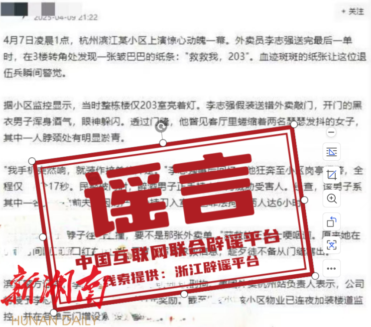 详情: 近日,一社交平台账号发布题为杭州“滨江区发生恶性刑事案,嫌疑人已被刑拘”的信息,引发网络关注。4月15日,杭州滨江公安分局发布情况说明称,经核查,文中所述“4月7日凌晨滨江区发生恶性案件”等内容纯属虚构。 该账号使用者谢某某(男,28岁,自由职业者)为博取流量关注,利用AI生成工具捏造虚假案情,经深度编辑后发布于社交平台。滨江警方已依法对谢某某作出行政处罚,责令立即删除全部不实信息,并处以500元罚款。(来源:浙江辟谣平台)