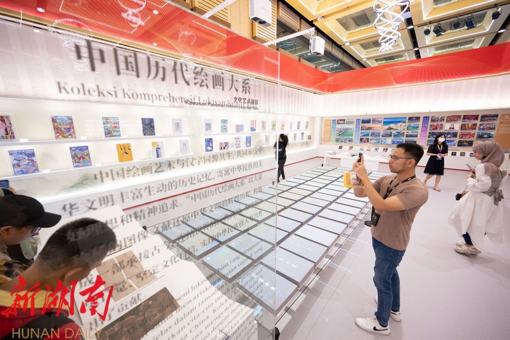 2023年5月26日,观众在马来西亚吉隆坡举行的第40届吉隆坡国际书展上观看“中国历代绘画大系”展览。由浙江大学、浙江省文物局编纂,浙江大学出版社出版的“中国历代绘画大系”,收录了海内外263家文博机构的纸、绢(含帛、绫)、麻等材质的中国古代绘画藏品12000余件(套),涵盖了绝大部分传世的“国宝”级绘画珍品。