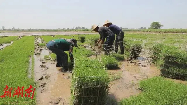 在坡头镇永丰垸村伍家湾进水闸,一排潜水泵开足马力,将沅江水引入沟渠,值班工作人员紧盯抽水泵,以防事故发生。在另一边的中心村,随着引入沟渠的水灌入稻田,农户们分工协作,取出育秧盘、驾驶插秧机作业等,不多时,田间插满了秧苗。