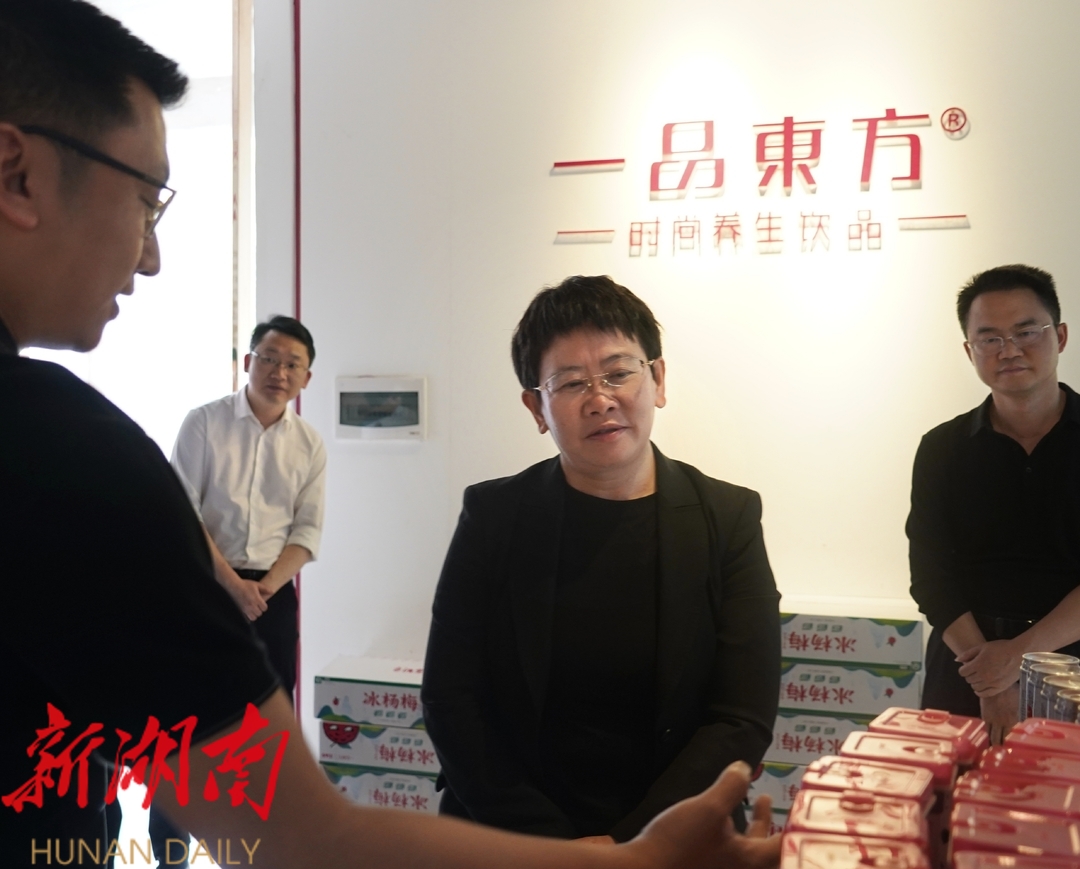 黄忆钢在一品东方生物科技公司详细了解杨梅饮品生产、销售情况(蒲湘萍 摄)