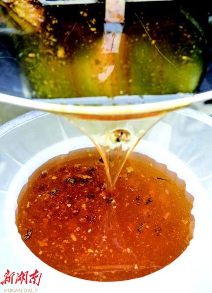 “香味浓,蜜体干净,甜而不腻,是好蜜!”科技特派员伍国强到场指导,闻了闻、尝了尝,连声夸赞,“浏阳的油菜花蜜一般很少,今年算是个例外。”