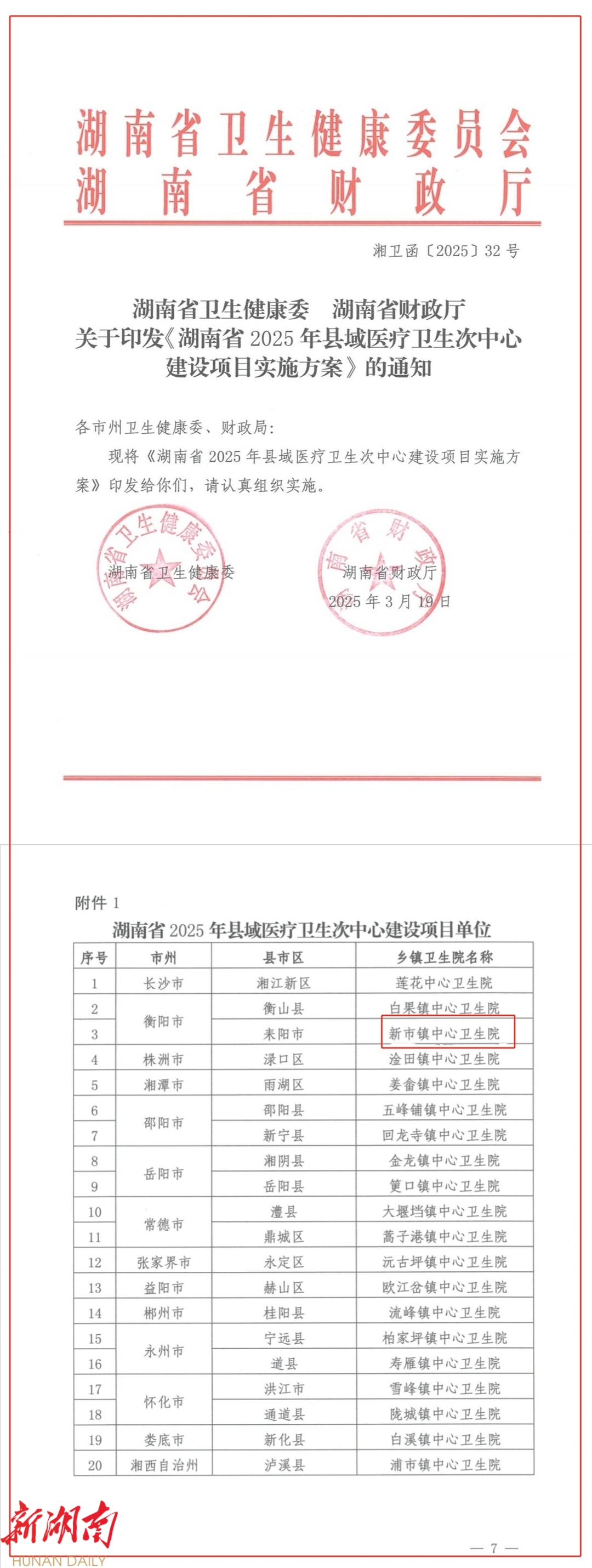 耒阳融媒4月17日讯(记者 刘源) 近日,省卫健委、财政厅公布2025年县域医疗卫生次中心名单,耒阳市新市镇中心卫生院成功入选。该院始建于1952年,是一级甲等综合性基层医院,2022年获评国家优质服务基层行"推荐标准",2023年摘得"国家卫生乡镇"称号,服务覆盖新市及周边多个乡镇十余万人口。