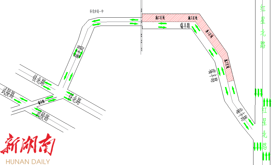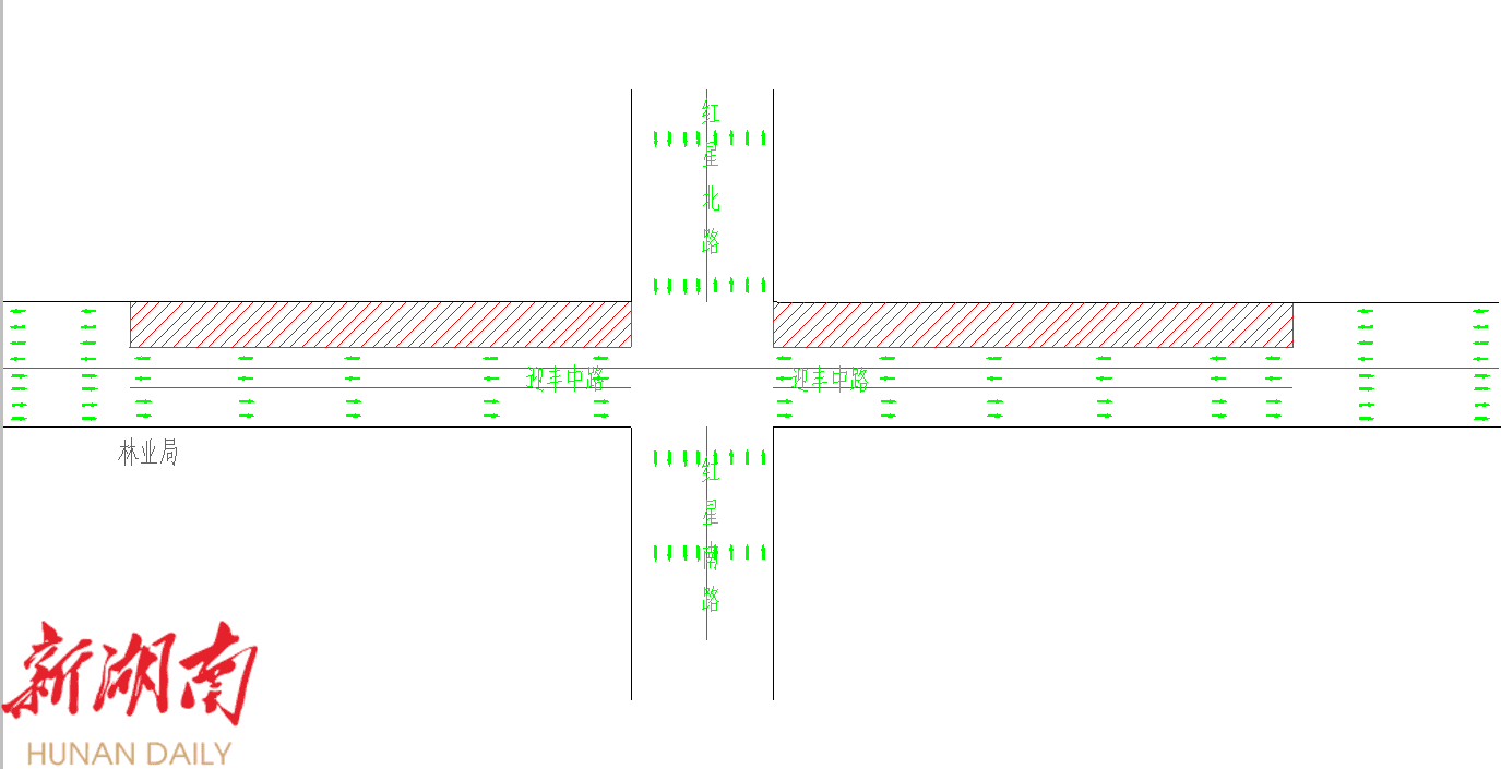 3.迎丰路(林业局至怀化市建筑设计研究院段)北半幅封闭施工期间,南半幅可双向五车道通行。