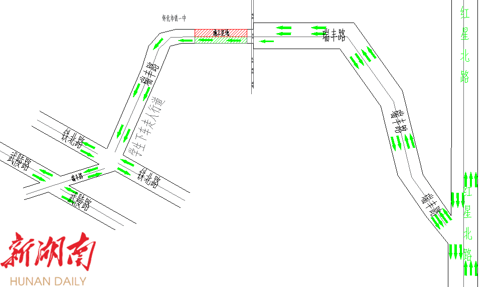 瑞丰路(怀化市铁一中至铁路桥洞段)北半幅施工交通绕行图