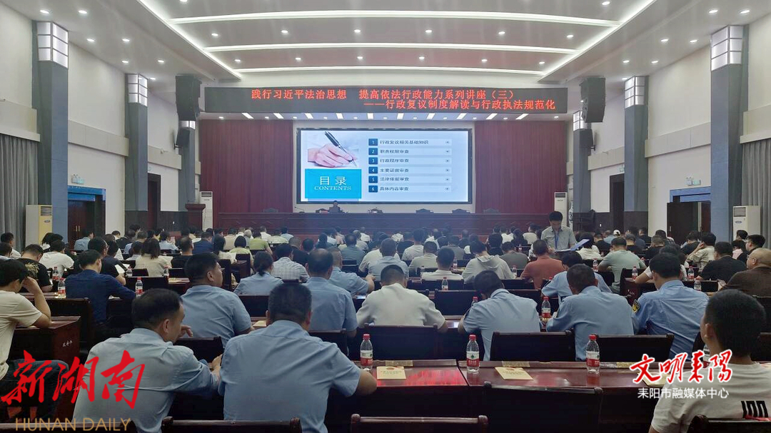 耒阳融媒4月19日讯(记者 刘源 李双鸿) 4月18日,我市举办“践行习近平法治思想 提高依法行政能力”第三场专题讲座。衡阳市公安局党委委员、耒阳市人民政府副市长、公安局党委书记李云龙主持会议,各相关单位及30个乡镇(街道)等200多人参加培训。