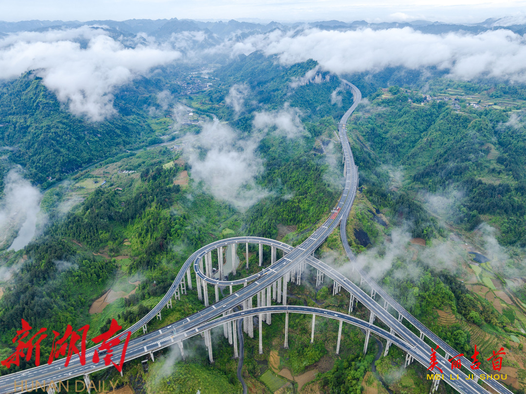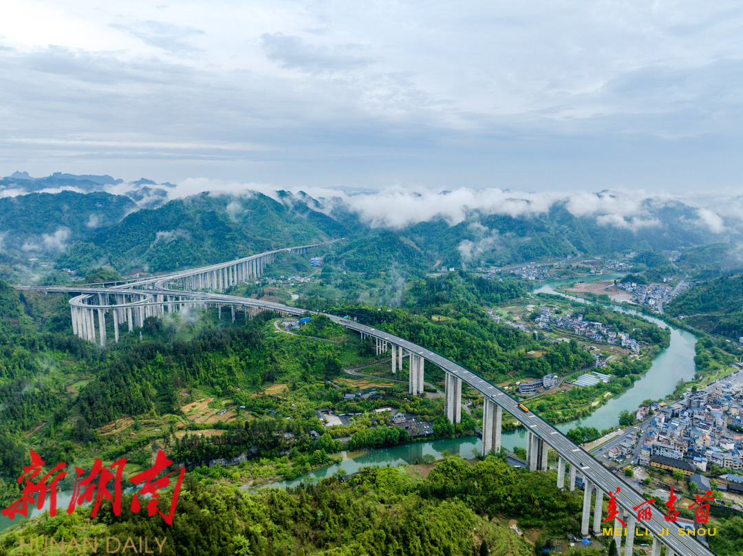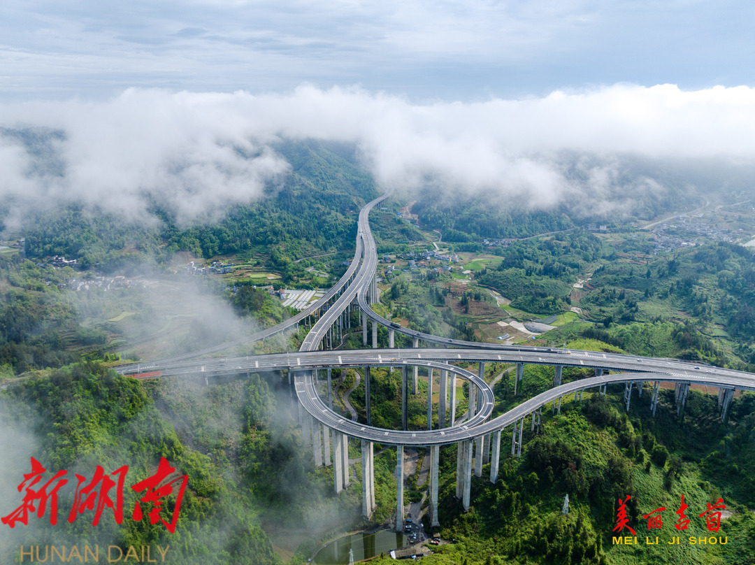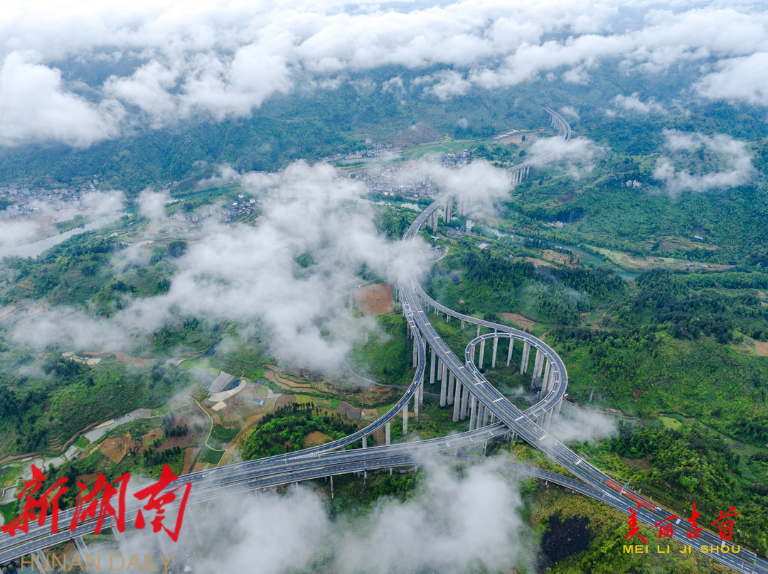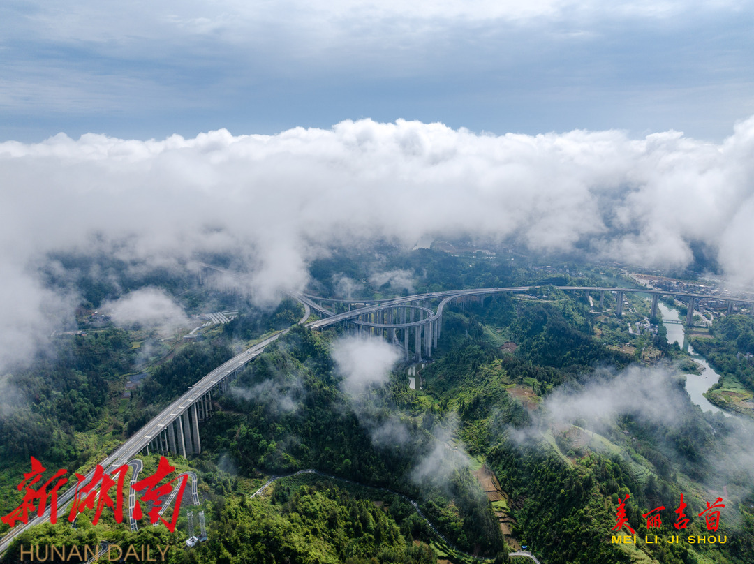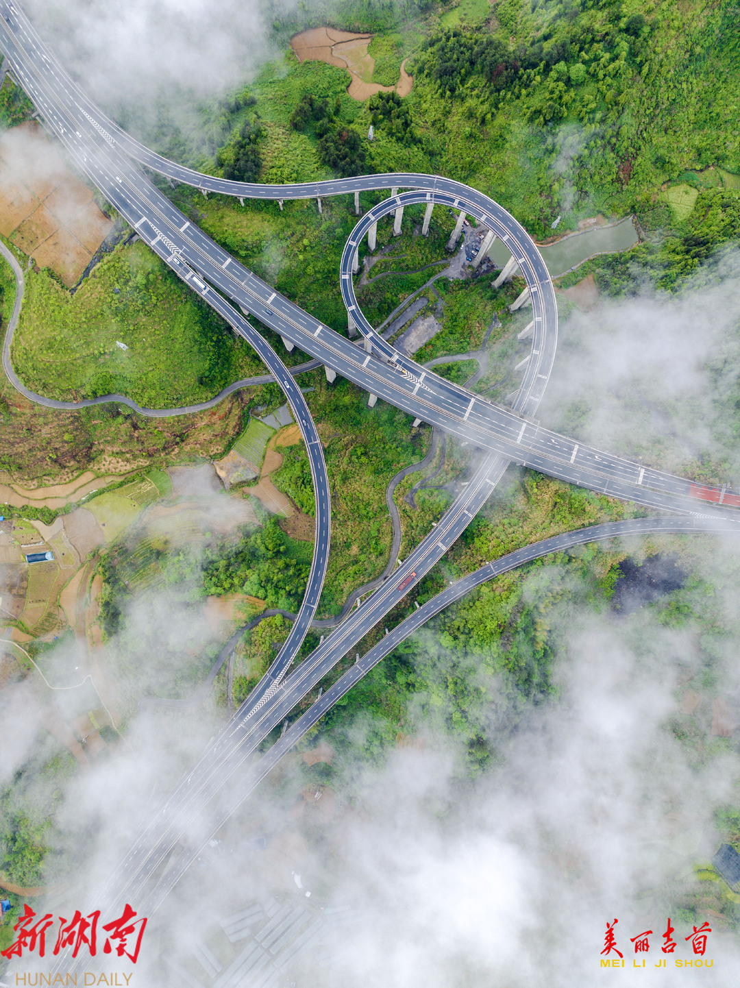吉首市融媒体中心4月20日讯(全媒体记者 彭璟) 2025年4月19日,吉首市石家寨高速公路互通立交桥附近云雾缭绕,层叠交错的桥体与河流、村庄、青山在流动的晨雾中若隐若现,现代交通建筑与自然气象共同交织出生态和谐之美。