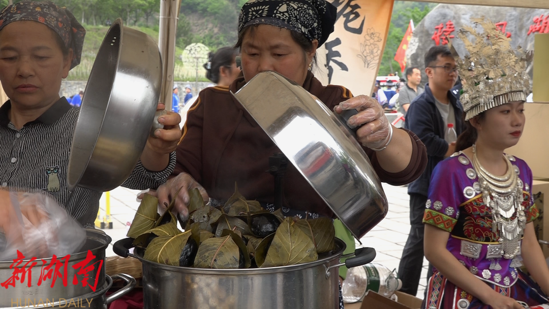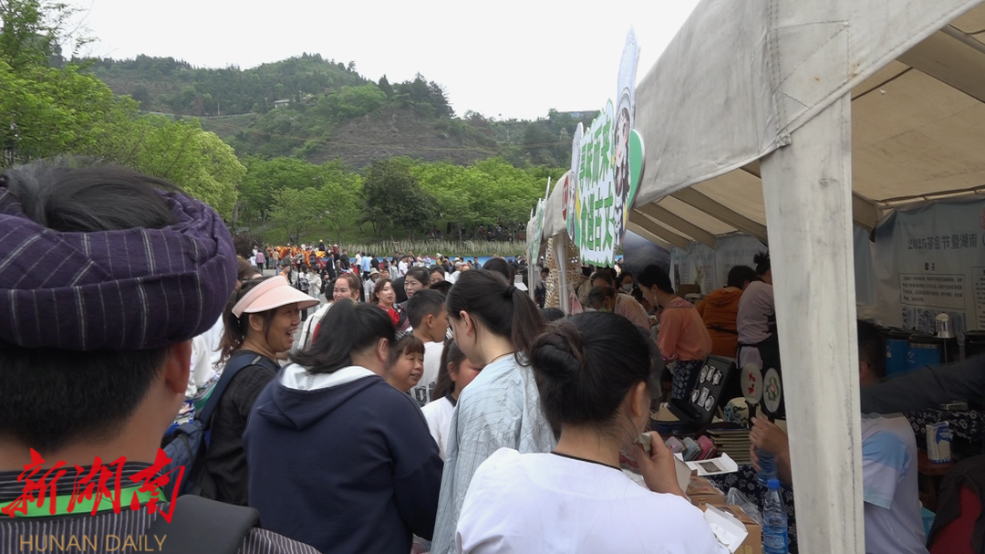 清晨,“茶乡集市”上热气蒸腾,摊位上汇集湘西腊肉、蒿草粑、米豆腐、泡菜等传统美食,碧绿的粑粑裹着粽叶清香涌出,鲜红的辣椒浇在米豆腐上,引得游客口齿生津、驻足品尝,感受“舌尖上的茶乡”魅力。古丈毛尖、古丈红茶、羊肚菌、绿壳鸡蛋等特色农产品集中展销,线上线下联动,村播大赛选手同步直播带货,推动“山货出湘”。