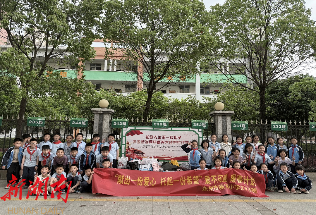 湖南日报·新湖南客户端4月20日讯(通讯员 荣婕雯 胡彩姣)4月19日,永州市蘋洲小学三年级233班开展了一场以“献出一份爱心,托起一份希望”为主题的“爱不闲置,暖春计划”公益活动。全班50余名学生在老师和家长们的协助下,纷纷捐献出自己闲置的衣物和玩具,为四川大凉山的孩子们送去春日温暖,用实际行动践行社会主义核心价值观,扣好人生“第一粒扣子”。