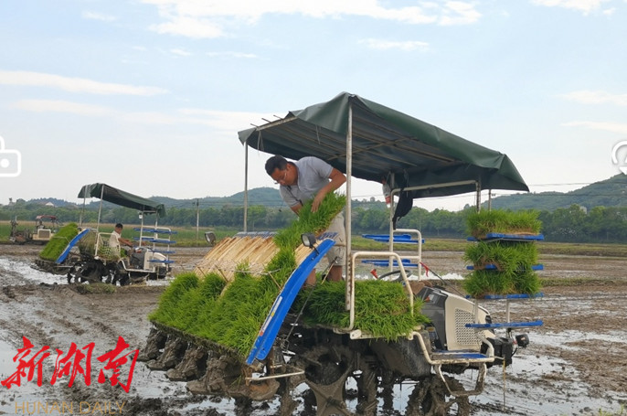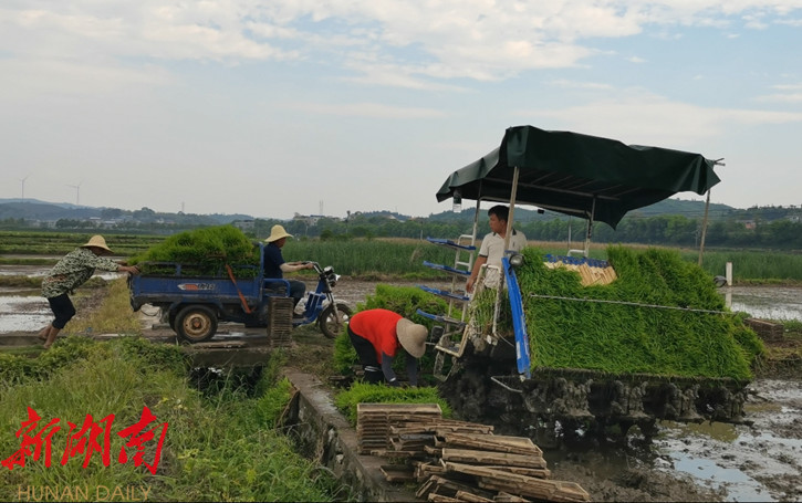 田埂上,粮农们忙着搬运育好的秧苗为插秧机补苗。机耕驾驶员称,一台插秧机一天能完成10亩以上作业。以21亩多的田块为例,人工栽插至少需15天,两台机子1天就能插完,机械化作业成本低、效率高。
