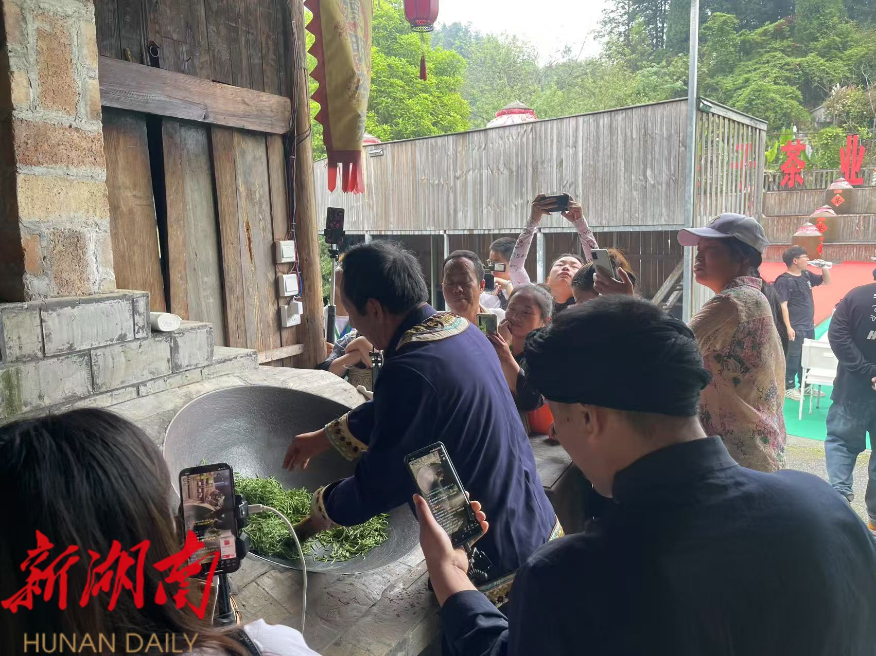 活动现场,年过六旬的古丈县第七届“金茶王”向仍坤亲自上阵,在热气蒸腾的铁锅中熟练演绎摊青、杀青、揉捻等八道古法工序。他的双手如灵动的舞者,精准把控着温度与力度。“炒的时候要抖得高、扬的开,使水分迅速散发,后等锅温降下来,炒至叶色暗绿、叶片粘手就可以出锅。”这些传承百年的制茶密码,通过主播们的镜头实时传递到千万网友的手机屏幕上。