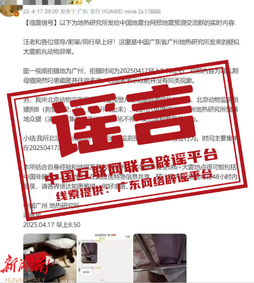真相: 4月17日上午9时,一位新浪微博认证为“科学科普博主”、IP属地显示在广东的网民发文称:“根据动物行为异常、地磁波动、经验数据分析等,判断将在48小时内发生6级以上强震”,引发关注。对此,4月17日晚,广州市地震局表示,动物异常行为与地震无必然因果关系。18日,广州市应急管理局回应,目前,广州市地震活动基本正常,地球物理观测没有显著变化。动物异常的因素多种多样,宏观动物异常与地震发生没有一一对应的关系。此外,根据现今地震预测的实际水平,很难做到非常精确地对地震时、空、强度的预测,所谓精准的“地震预测”是不可信的,也是多年反复在各地出现的地震谣言,只不过换成了当地的地名而已。在此郑重提醒大家:只有政府有权发布地震预报,其他任何部门、单位或个人都无权发布地震预报。因此切勿相信与地震有关的一切非官方信息,更勿传谣,不让谣言造成二次伤害。(来源:@应急管理部、“广东省互联网举报中心”微信公众号)
