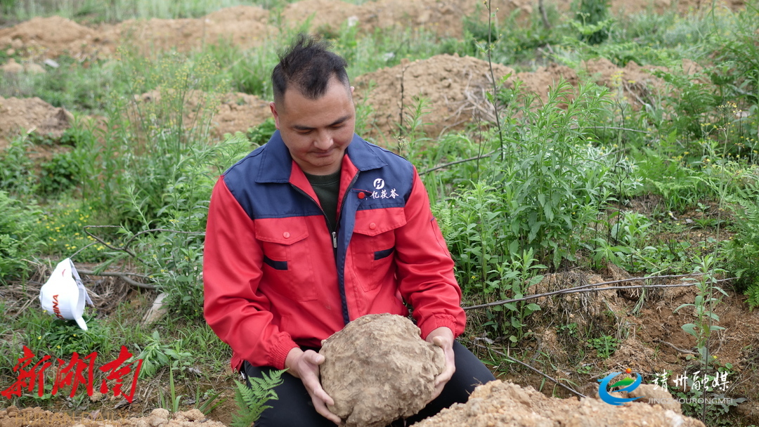 靖州融媒4月22日讯 (记者 胡映辉 孙文月)4月21日,在靖州苗族侗族自治县新厂镇姚家村,华亿茯苓科技有限公司茯苓种植基地内,工人们正手拿锄头采挖鲜茯苓,一派丰收景象。
