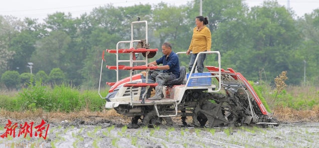 随着机器轰鸣声响起,多台高速插秧机驶入水田,在田间穿梭自如。高速插秧机通过自动化的取秧、分秧、插秧装置,将秧苗精准插入泥中,同时确保行距、株距均匀一致,秧苗间距精准控制在12-14厘米,保证水稻生长有充足的空间和光照。