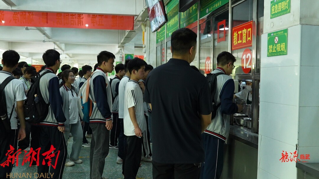 中午12点,在临武一中的食堂打餐处,值日教师根据学生体型和需求指导食量,学生们有序排队按需取餐。餐盘回收处显示,九成以上学生实现“光盘”。