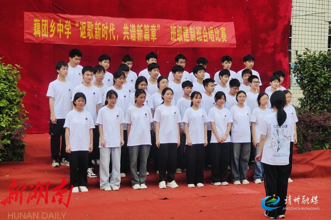 靖州融媒4月22日讯 (通讯员 陶泳君 谢文杰)4月21日,靖州苗族侗族自治县藕团中学举行建制班合唱比赛,该校六个班级以“讴歌新时代,共谱新篇章”为主题,在操场奏响青春强音。