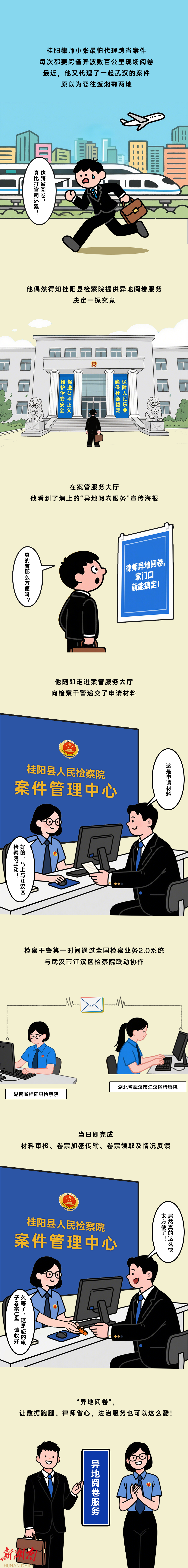 新湖南客户端4月23日讯 (通讯员 龚灿文 伍品倩)“原以为要往返湘鄂两地,没想到在‘家门口’就拿到了案卷,为检察机关的高效服务点赞!”近日,桂阳县的张 律师 通过当地检察院“异地阅卷”服务,实现足不出县获取跨省电子卷宗。这一便捷体验,是检察机关依托数字技术打破地域壁垒的生动实践。