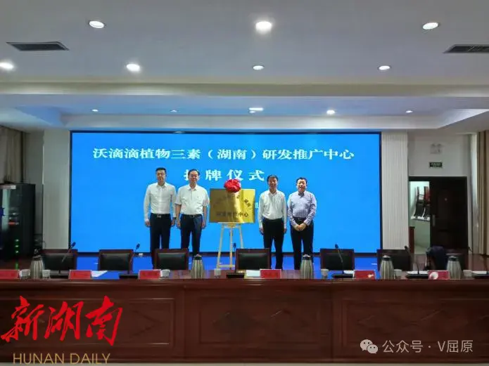会前,毛七星和向科军共同为沃滴滴植物三素(湖南)研发推广中心揭牌。随后召开座谈会,集体观看沃滴滴植物三素研发推广宣传片,听取屈原管理区区情、项目以及实验试种情况介绍。