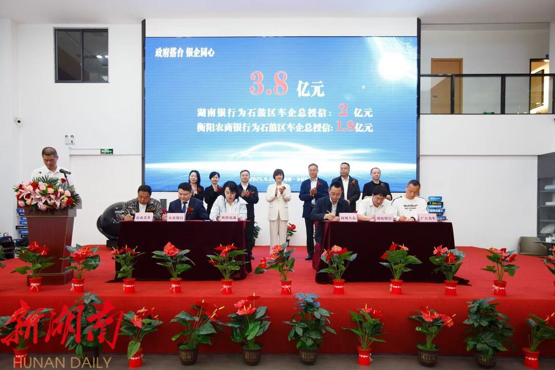 仪式上,湖南银行衡阳分行、衡阳农商银行与车企代表进行了合作签约,两家银行总共为石鼓汽车销售企业授信3.8亿元。谢海蓉、赵波等领导授予了12位车企代表“汽车‘以旧换新’优秀单位”称号。