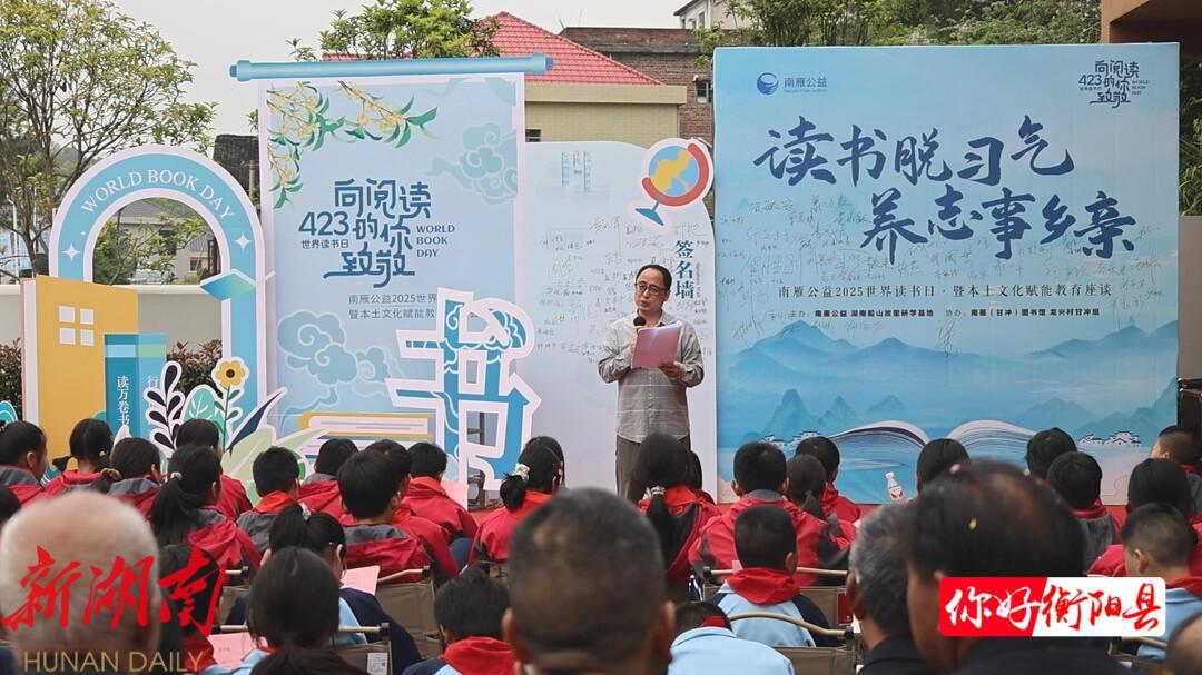 衡阳县融媒4月24日讯(记者:吴展名 ) 4月23日,位于金兰镇龙兴村的南雁甘冲图书馆举办“读书脱习气 养志事乡亲”2025世界读书日活动,通过讲述本土名人故事和读书分享等方式,将厚重的本土文化转化为滋养少年心灵的春日养分,为乡村教育注入鲜活生命力。