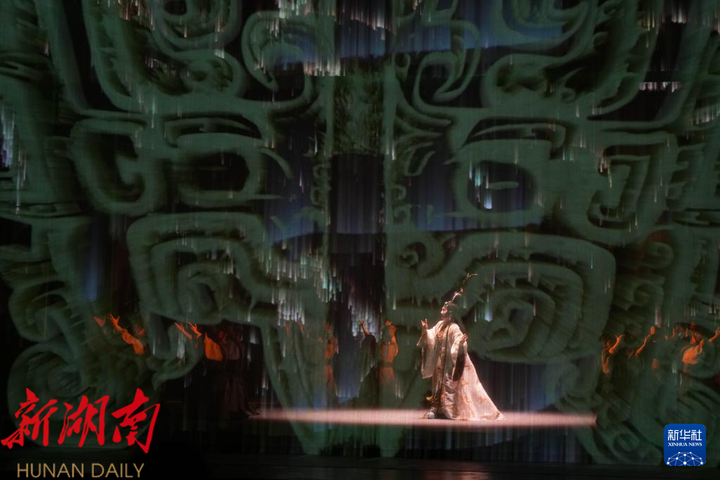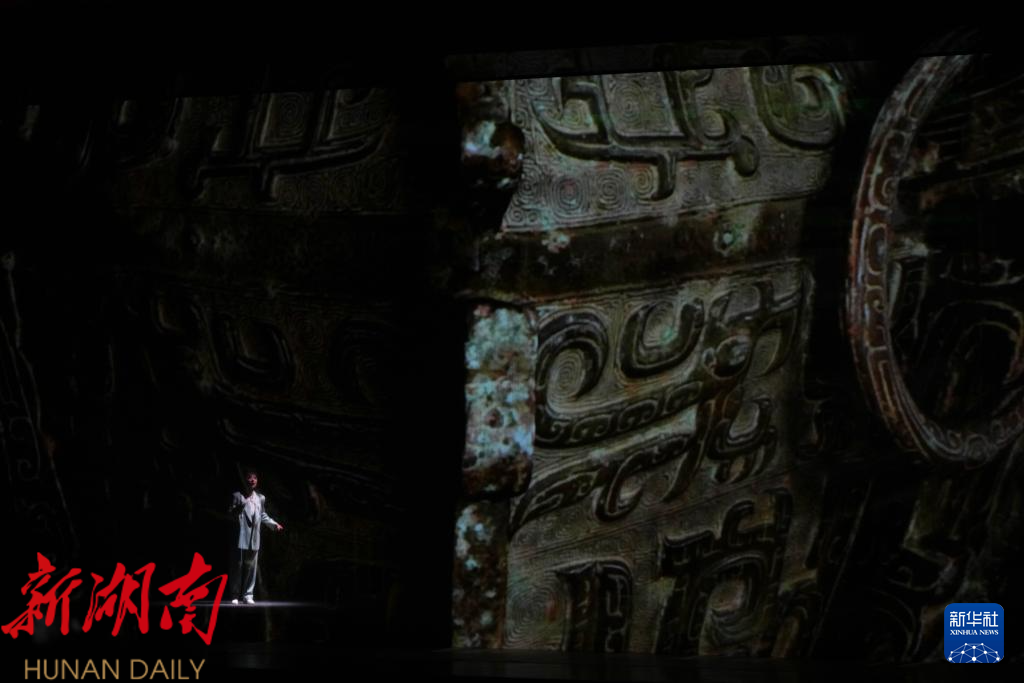 4月23日,演员在湖南大剧院演出新编京剧《皿方罍》,皿方罍的部分纹饰被投影在纱幕上。