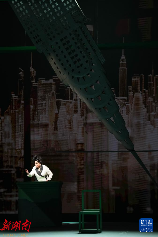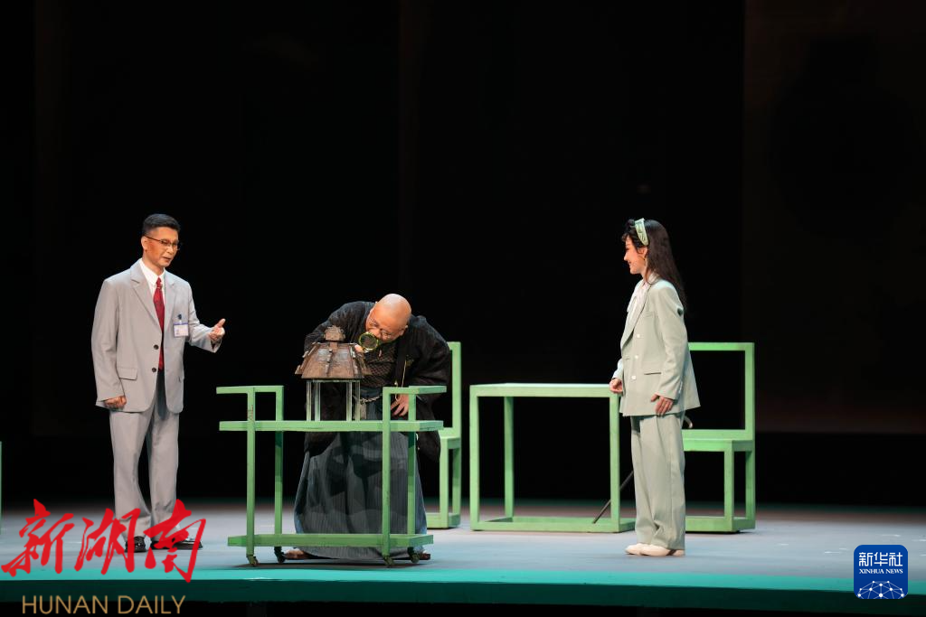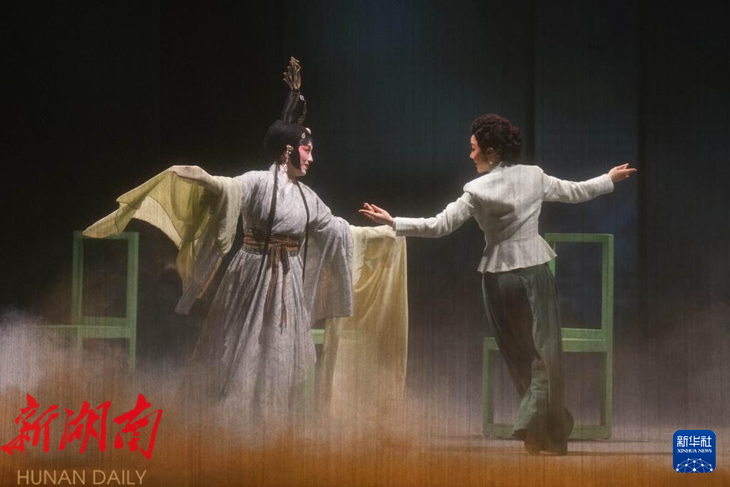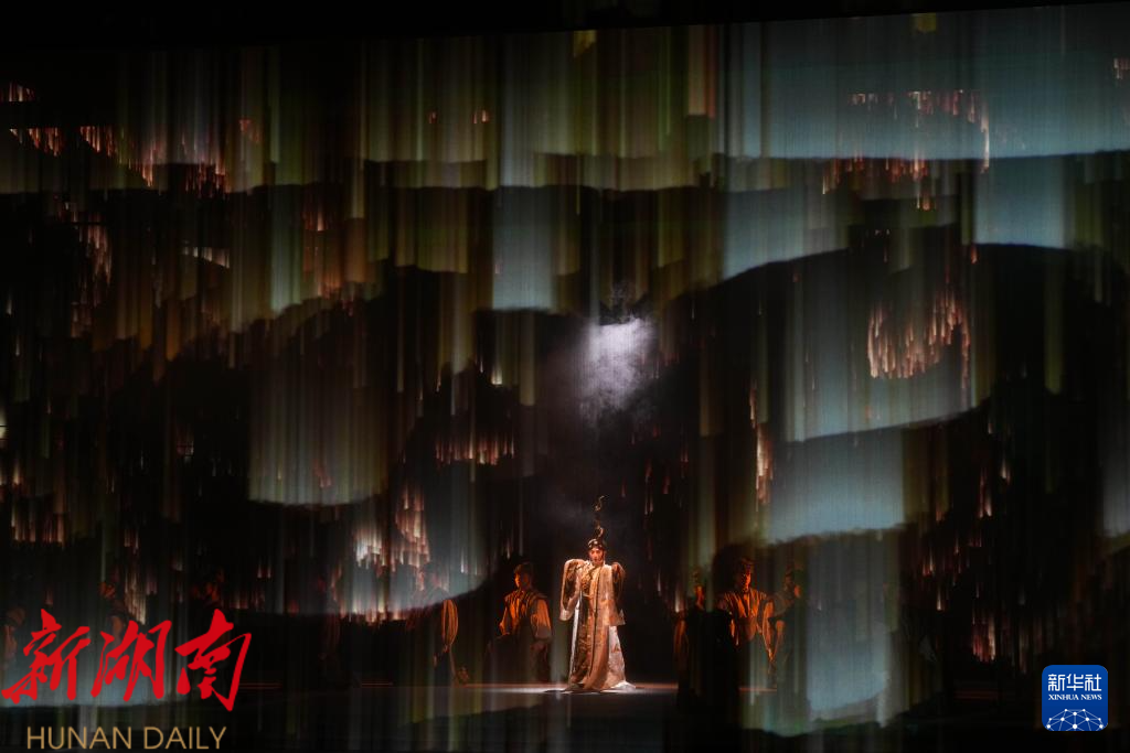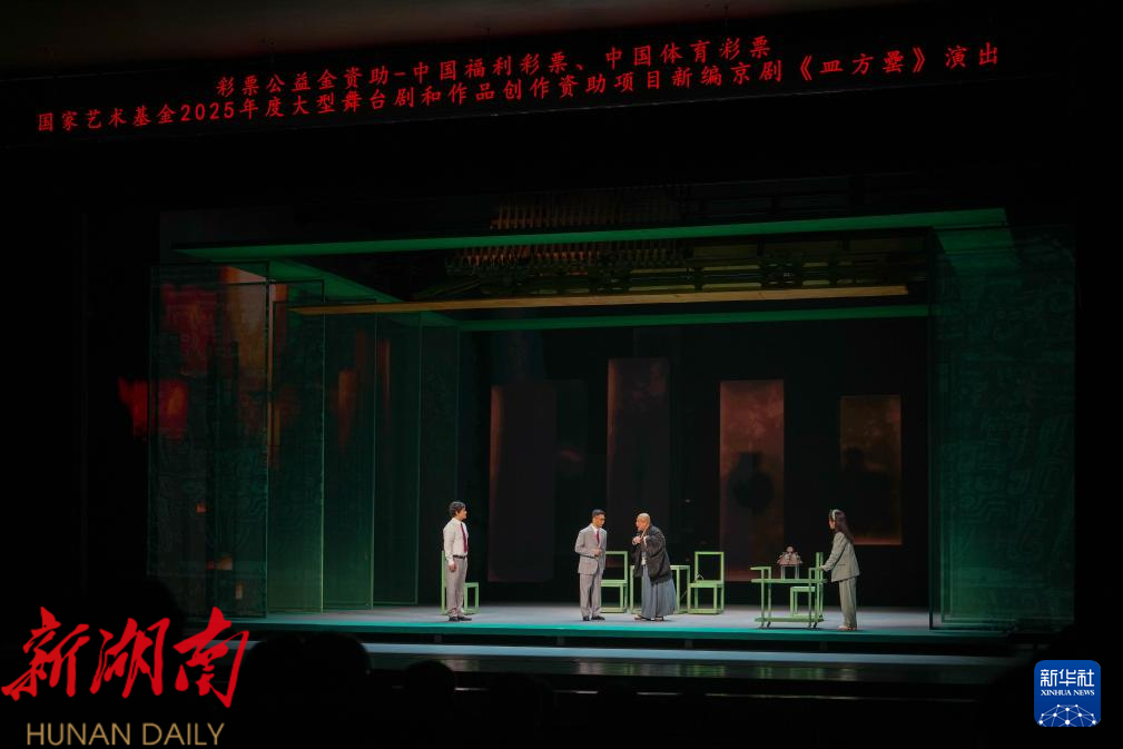 4月22日、23日晚,国家艺术基金2025年度大型舞台剧和作品创作资助项目——京剧《皿方罍》在湖南大剧院上演。新编京剧《皿方罍》由湖南省京剧保护传承中心创排,以国宝皿方罍百岁流转的真实史料为依据,讲述了1992年至2014年间,流失海外的皿方罍器身三度现世,终在多方努力下身盖合一、完罍归湘的故事。该剧还运用纱幕投影技术,打破传统京剧的舞台限制,营造出裸眼3D效果,使国宝故事更具感染力。