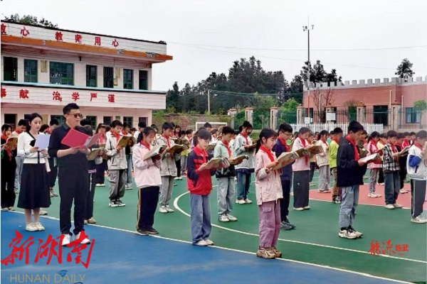 4月23日,临武县同益小学举行“书香润童心·阅读伴成长”读书月活动启动仪式。全体师生齐诵经典诗歌《中华少年》,用琅琅书声将阅读的种子播散到校园的每个角落。(通讯员:陈亭 沈明春)