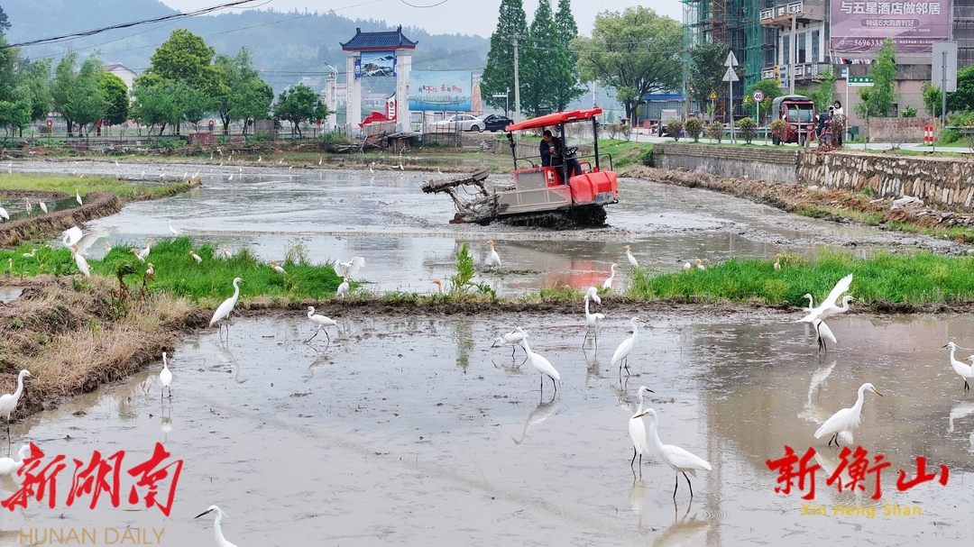 新衡山客户端4月24日讯(记者:廖晶 文雅婷 通讯员:阳发鑫) 当前正值春耕时节,喧闹的农机吸引了成群的白鹭、牛背鹭等集聚田间,与农机、稻田、群山构成了一幅美丽和谐的生态画图。