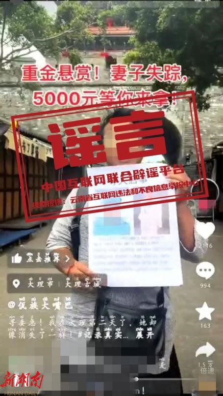 辟谣:编造“重金悬赏寻妻”虚假信息博取眼球,被依法查处