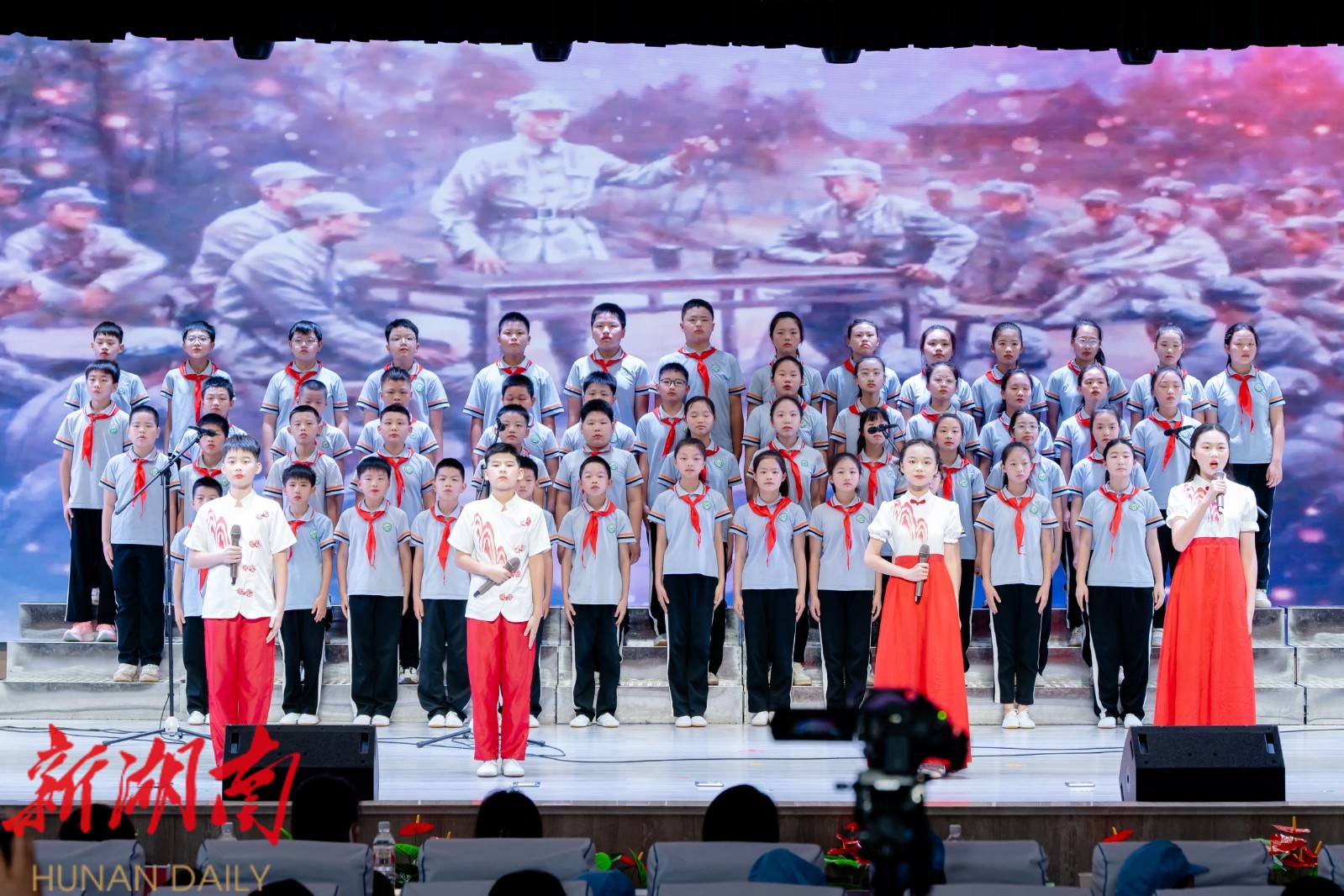 活动在庄严而激昂的氛围中拉开帷幕。舞台上,学生们身着整齐的校服,手持书卷,用稚嫩而坚定的声音,将一篇篇革命经典课文生动呈现。《一个粗瓷大碗》《黄继光》《手术台就是阵地》《黄河颂》《少年中国说》等经典作品在孩子们的诵读下,仿佛穿越时空,重现了那段波澜壮阔的革命岁月。