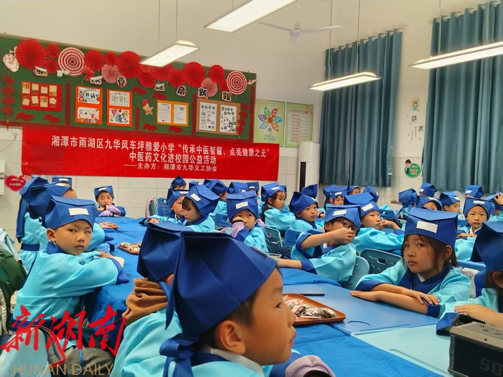 雨湖融媒4月25日讯 (通讯员 张利平 宋明)4月24日,由雨湖区教育局指导,九华义工协会承办的“传承中医智慧 点亮健康之光”中医药文化进校园公益课堂在九华风车坪雅爱学校启动。
