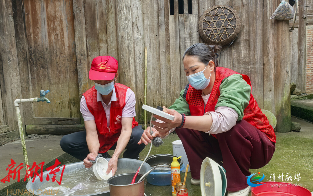 工作人员为残疾人家庭洗碗(周悦伊 摄)