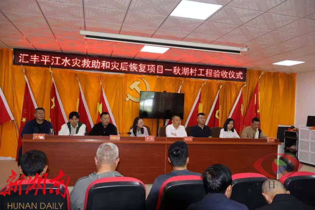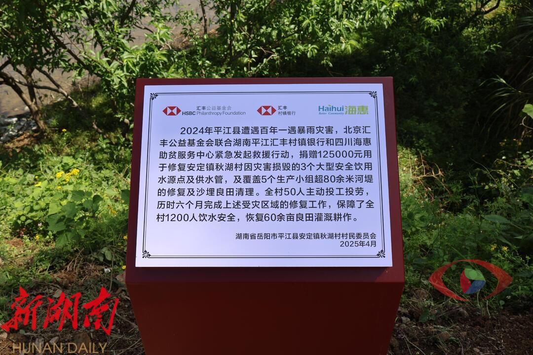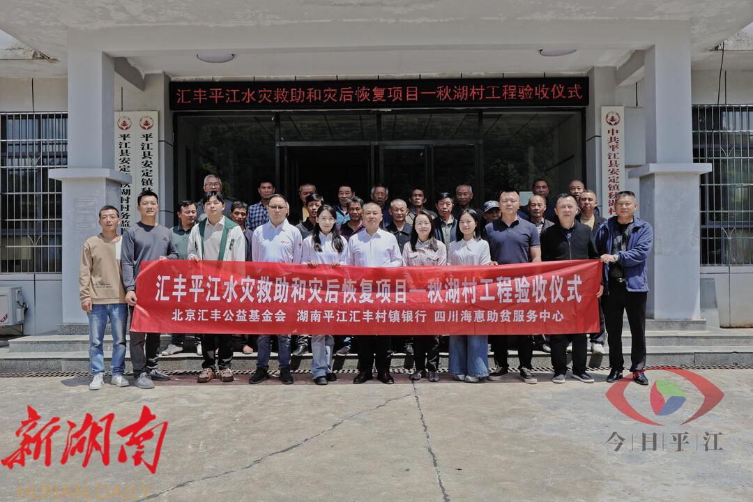 2025年4月25日上午, 汇丰平江水灾救助和灾后恢复项目——秋湖村安全饮用水、农田水利修复工程 竣工验收典礼于湖南省平江县安定镇秋湖村朱屋组隆重举行。共青团岳阳市委、平江县安定镇政府、湖南平江汇丰村镇银行、四川海惠助贫服务中心等各方代表,以及秋湖村理事会小组成员,党员、村民小组组长、群众代表,筹工筹劳人员代表等共同参与,一起见证灾后重建的里程碑成果,携手探索韧性社区建设的初步成效。