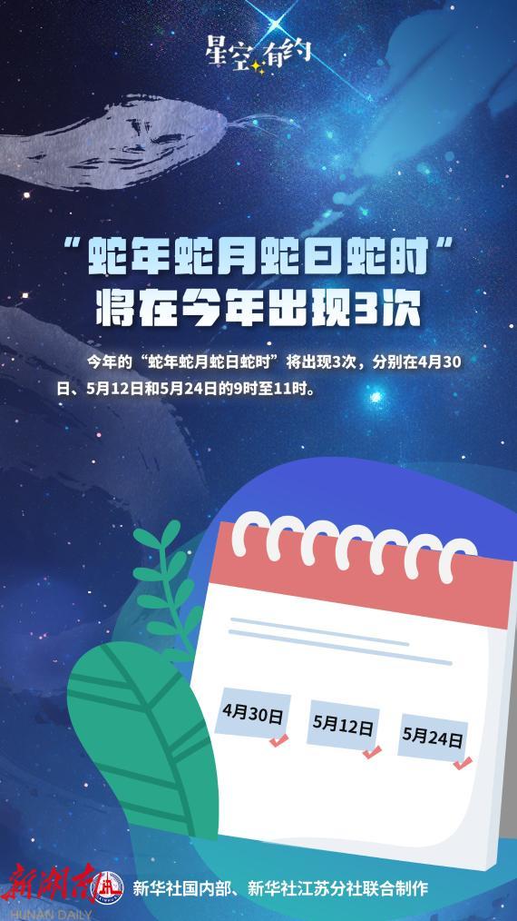 王科超说,今年的“蛇年蛇月蛇日蛇时”现象将出现3次,分别在4月30日、5月12日和5月24日的9时至11时。 “三次的间隔时间与干支纪日的方法有关,由于地支有十二个,因此每隔12天就出现一个带‘巳’字的日子。”