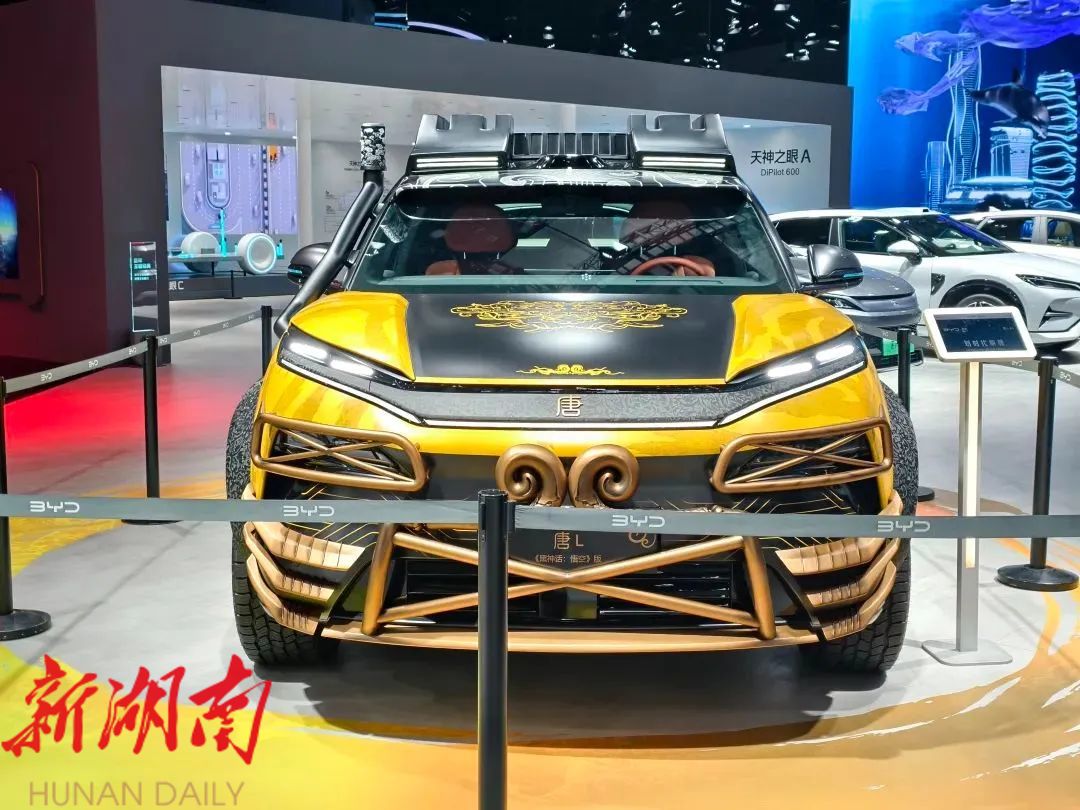在比亚迪站台上,比亚迪王朝网唐L、汉L携全球量产最快的兆瓦闪充技术震撼亮相,联合《黑神话:悟空》联名改装车演绎东方美学跨界,更有Dynasty-D全尺寸概念车首秀,以龙颜设计美学与超级e平台技术。