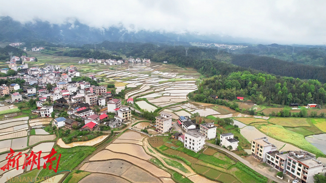 4月29日,记者来到平栋村,只见成片的梯田蓄满春雨,雪峰山脉云雾缭绕,飘逸的云海层叠相拥,似流动的水墨画卷,青葱山林环抱,田间水光澄净,山塘宛如玉盘镶嵌其中,民居依山而建,美不胜收。