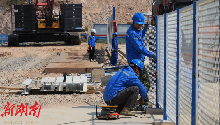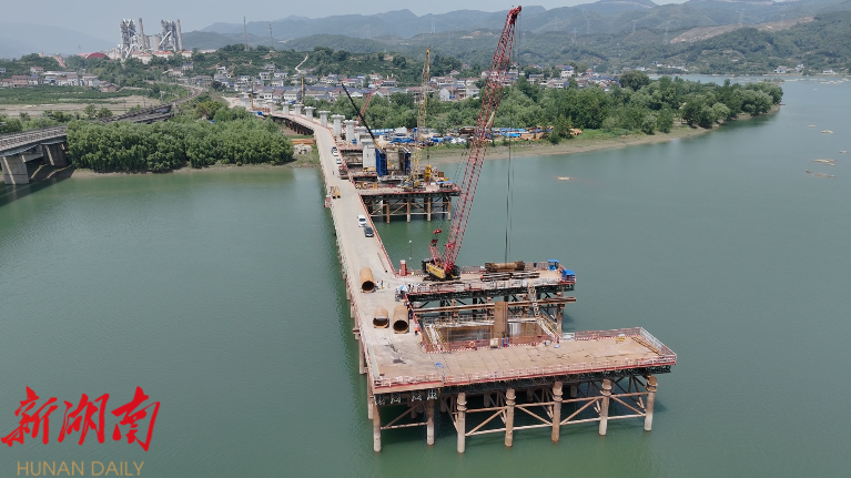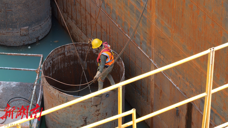 铁路专用线工程澧水特大桥项目建设同样争分夺秒。面对水深超60米的施工难题,建设者创新采用“旋挖钻+潜水员协同作业法”,攻坚克难完成深水墩基础施工。陕煤石门铁路专用线项目项目经理 蔡忠介绍说:“ 我们这个桥主要是存在深水基础,其中有4个深水墩,目前已完成2个深水基础的墩子施工,另外两个基础正在下双壁钢围堰,力争5月15日把双壁钢围堰安装到位。为了实现铁路专用线年底开通目标,我们五一期间不放假,做到24小时轮班作业,来确保工期的兑现。”