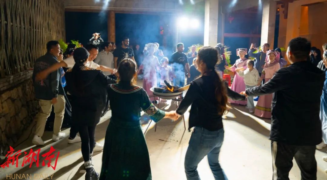 湖南日报·新湖南客户端4月30日讯(通讯员: 高丽文 瞿桂林 张骞)4月28日晚,阿巴砦景区灯火璀璨、歌声飞扬,一场充满土家族风情的篝火晚会在这里举行。来自阿联酋的游客与当地群众围坐在一起,在专业歌手的带领下,饶有兴致地跟随学唱桑植民歌。尽管发音生涩,但他们专注模仿歌词韵律的模样,尽显对桑植文化的浓厚兴趣。当众人齐声用中文喊出“歌里画里·桑植等你”时,热情的欢呼声与掌声在山谷间回荡,将现场气氛推向高潮。