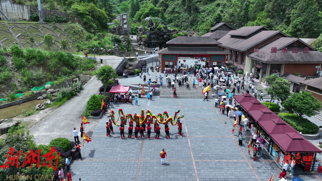 景区入口处,一场精彩的“跳龙”表演正在上演。20余名队员手持龙杆,随着鼓点节奏舞动长龙,时而蜿蜒如流水,时而翻腾似云海,吸引众多游客驻足观赏。这项省级非物质文化遗产的展示,让游客感受到传统文化的魅力。