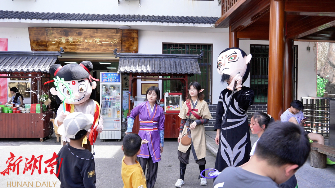 洞口县古楼驿生态文化旅游区将传统民俗与新潮艺术相结合,推出哪吒巡游茶园、国风打卡、红色旅游等活动,景区内数十名盛装打扮的哪吒、敖丙、太乙真人、申公豹在景区内与游客进行精彩互动。