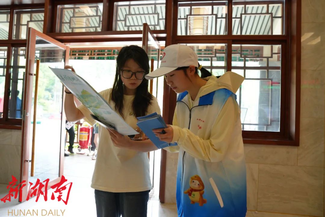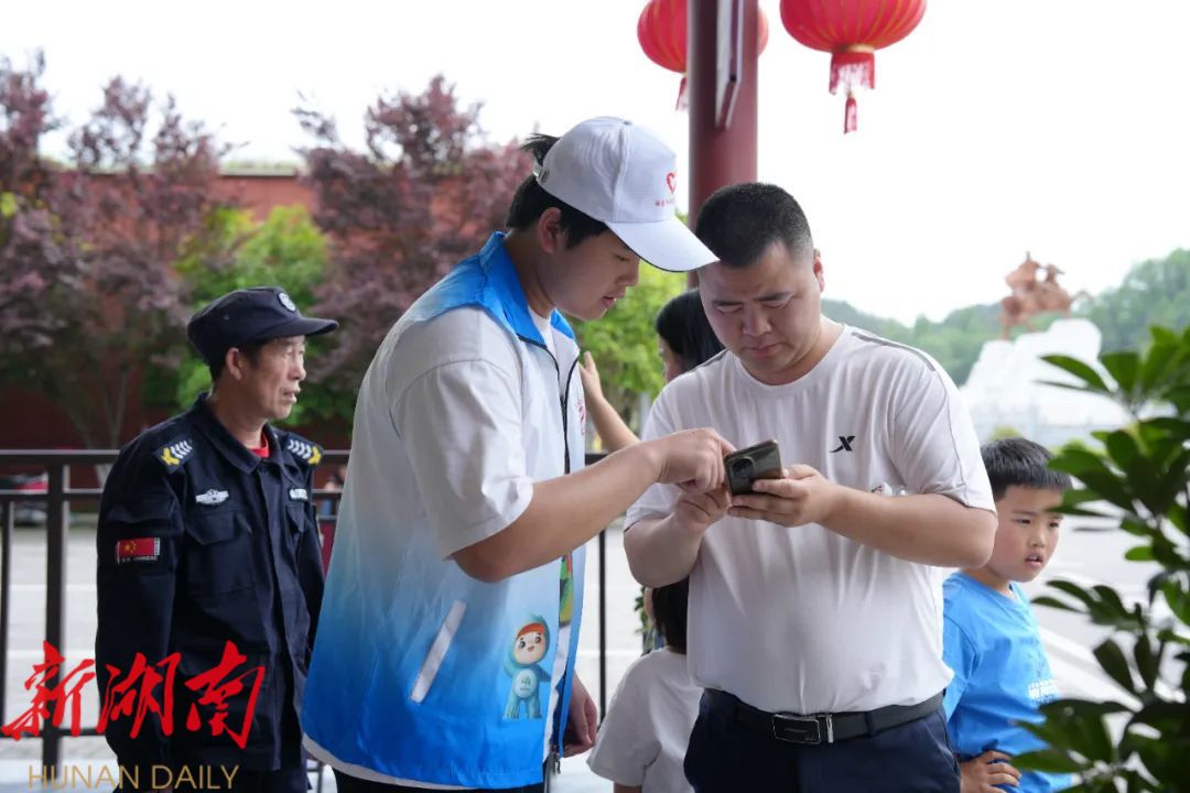 “您可以通过官方平台线上购票,还可以参与学唱桑植民歌活动赢取门票优惠。”5月2日,在骄阳似火的九天洞景区,来自桑植一中高一年级的学生龚沅钦正在耐心为游客提供咨询服务。面对外地游客,她主动上前递上旅游指南,细致解答购票流程、旅游线路等问题。在她周到的服务下,游客们的焦虑逐渐消散,脸上露出安心的笑容。